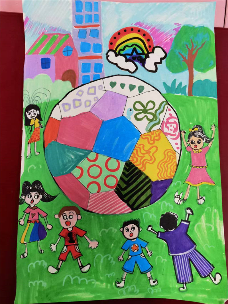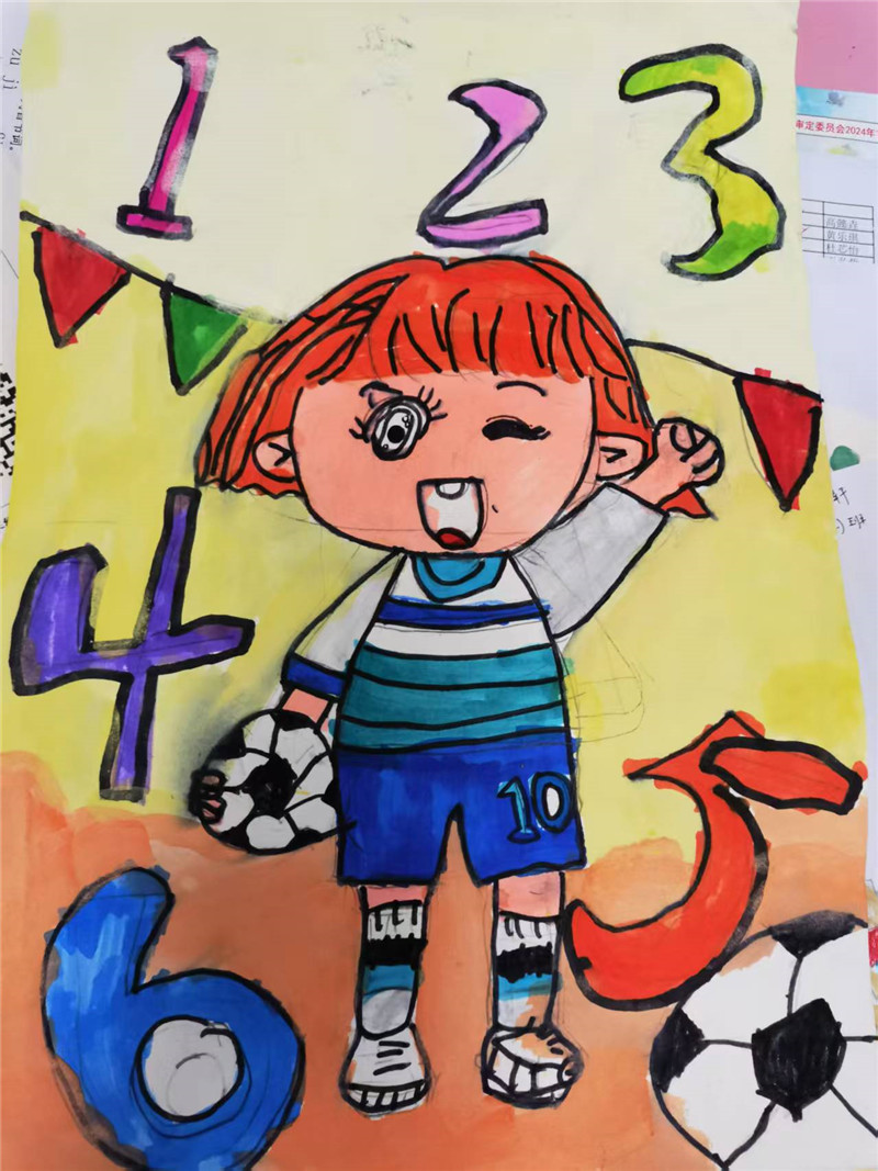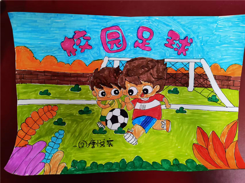 在常州市武进区实验小学分校,一群充满创意的学生用画笔勾勒出了他们心中的“常宝足球”世界,一幅幅色彩斑斓的绘画作品,将校园足球的活力与激情展现得淋漓尽致。 在这些作品中,有的画面以巨大的创意足球为中心,色彩缤纷的图案仿佛是孩子们对足球运动的无限想象,周围的小伙伴们或欢呼、或奔跑,在绿草如茵的场地上演绎着足球的快乐;还有的作品聚焦于校园足球赛场,两个小球员在球门前奋力拼抢,“校园足球”的字样格外醒目,将校园里的足球竞技瞬间定格在画纸上。 这些绘画作品不仅是学生们艺术才华的展示,更是他们对足球运动和热爱家乡常州的生动表达。通过画笔,孩子们把对足球的憧憬、对运动的热情和为苏超加油的激情融入其中,展现出常州市武进区实验小学分校在校园足球文化建设上的丰硕成果,也让“常宝足球”的魅力在童真的艺术创作中绽放光彩。